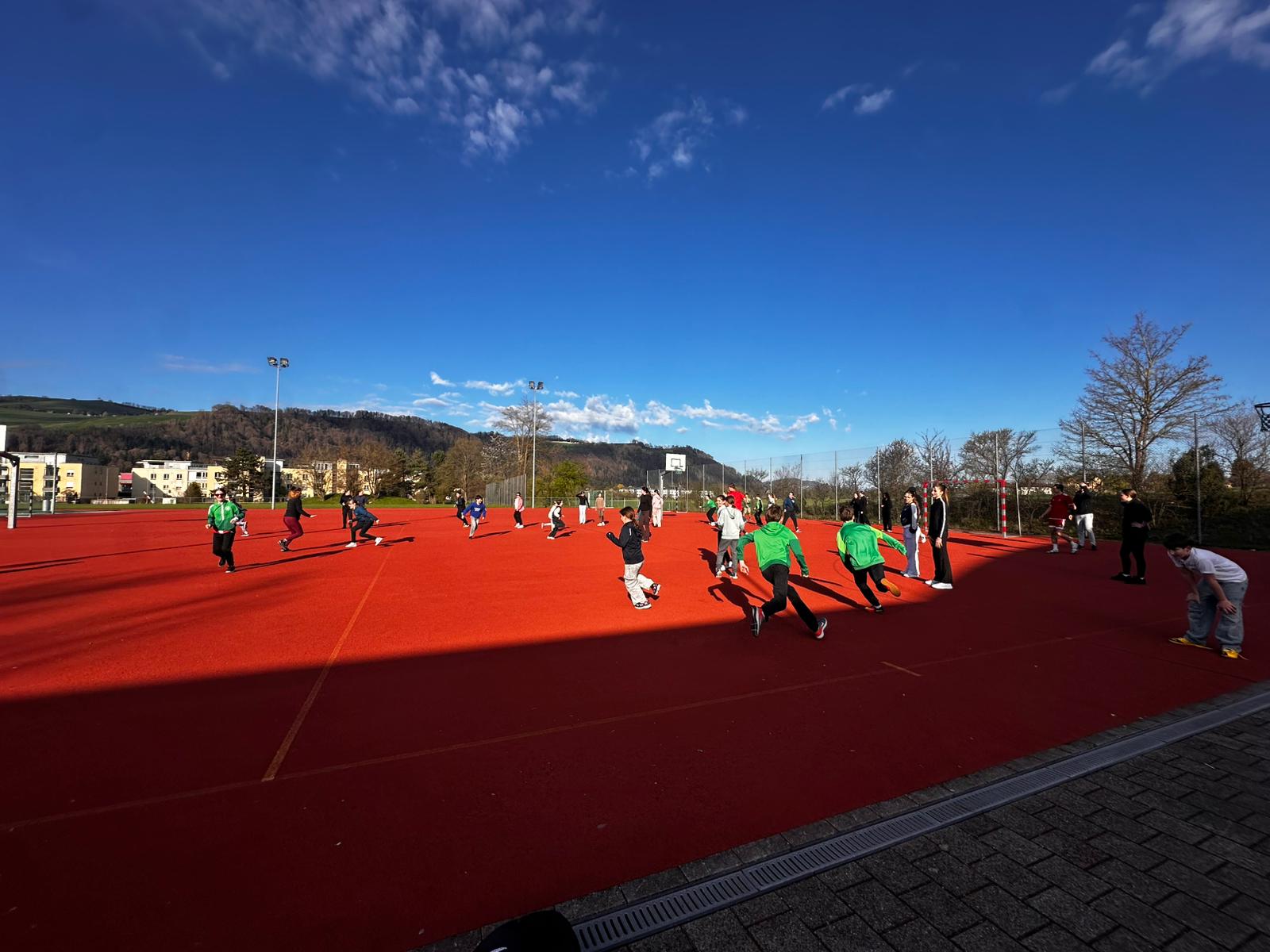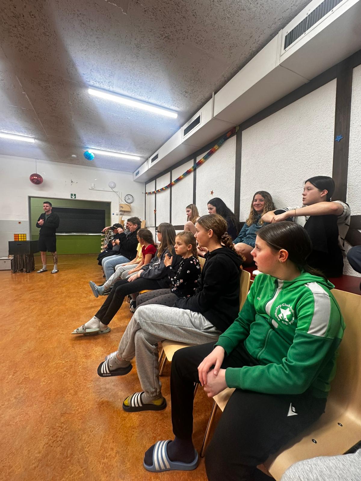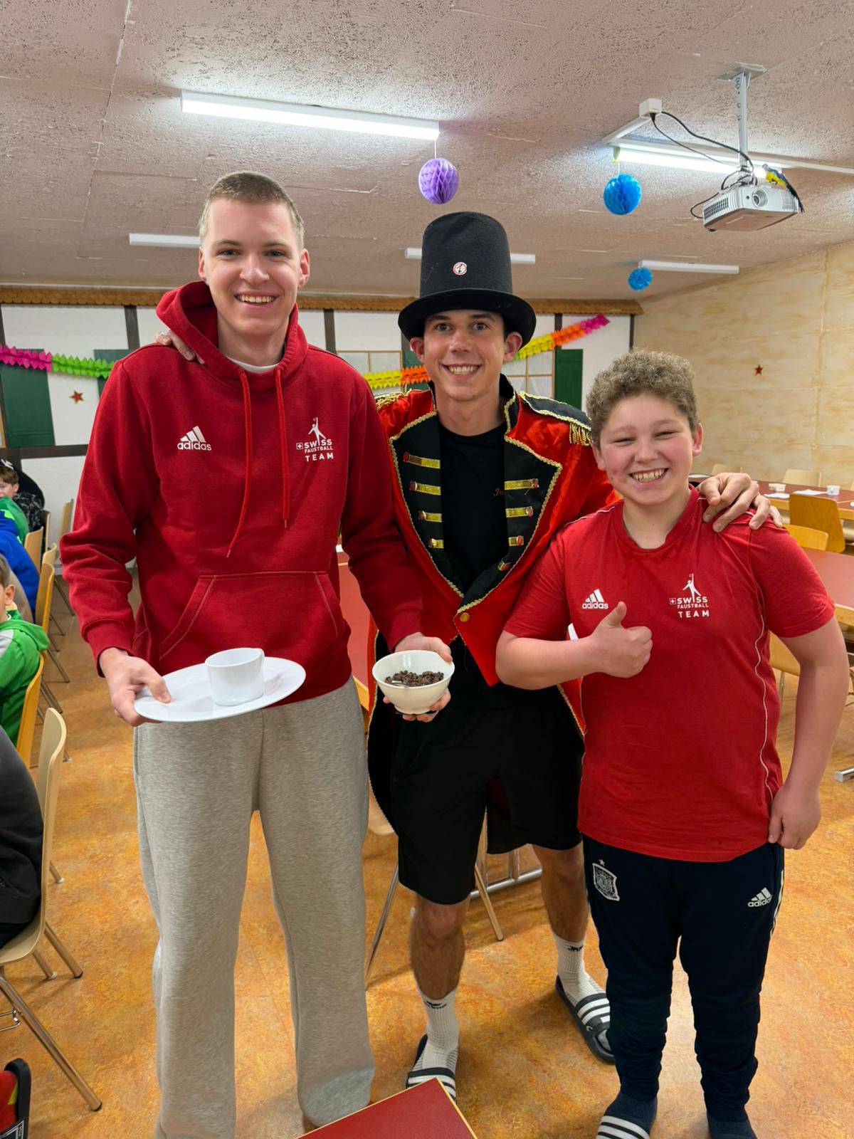 Am frühen Morgen sind wir von lauter Musik geweckt worden, zum Frühstück gab es Cornflakes, Müesli und Brot mit Aufstrich. Nach dem Essen hatten wir Zeit für unsere Ämtli , danach machten wir uns ready und dann hiess es Abmarsch. Unten in der Turnhalle angekommen, wollten wir uns in der Turnhalle aufwärmen. Da aber der Hallenabwart die Türöffnung verpasste, mussten wir uns draussen auf dem Platz aufwärmen. Anschliessend gingen alle in ihre Sparten und führten ihr Programm durch. Um 11:30 ging es wieder auf den Marsch, mit Hecht und co. Zum Zmittag gab es dann Chicken Nuggets, gebratene Kartoffeln, gekochte Rüebli, Salat und für die, die Lust hatten noch eine Gemüsesuppe. Im Anschluss erledigten wir wieder unsere Ämtli und hatten noch eine kurze Mittagspause. Nach dem Mittag, wieder in der Turnhalle angekommen gingen wir wieder in unsere Gruppen und haben anschliessend unsere Trainings. Um 15:30 versammelten wir uns alle für das Sitzball und später noch für die Massage nach dem Duschen. Zum Abendessen gab es dann Wähe mit verschiedener Variationen. Nach dem Essen ging es wieder an die Ämtli und wir hatten Zeit für die Wochenaufgabe. Um 20:00 versammelten wir uns zum nächsten Programmpunkt, es erwartete uns ein Zauberer. Er zeigte spektakuläre Zaubertricks und beeindruckte uns. Zum Abschluss des Tages gab es noch Kuchen von unserem Tagesbesuch Jan Vonäsch und Silja Kupferschmid. Nachtruhe war um 22:00 und wir konnten „friedlich“ schlafen gehen.